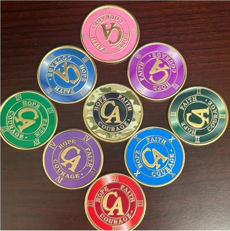Ces médaillons sur commande spéciale seulement pour les années de rétablissement. Ce sont les jalons du temps de sobriété continu de la cocaïne et de tous les autres substances qui altèrent le comportement, de une ou plusieurs années..
